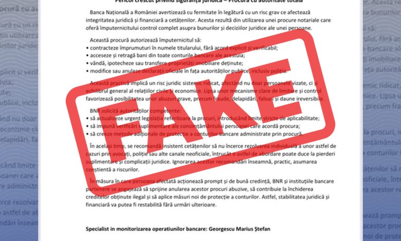 Banca Națională a României (BNR) atrage atenția publicului că documentul „Pericol crescut privind siguranța juridică – Procură cu autoritate totală” care circulă în spațiul online, datat 03.11.2025 și purtând sigla instituției, reprezintă un fals.
