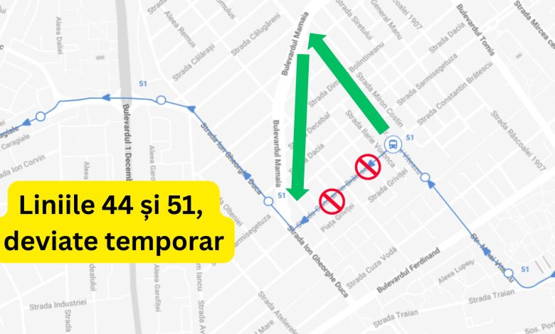 Pe perioada cât vor circula deviat, autobuzele de pe liniile 44 și 51 vor opri în stația Mihai Viteazul.