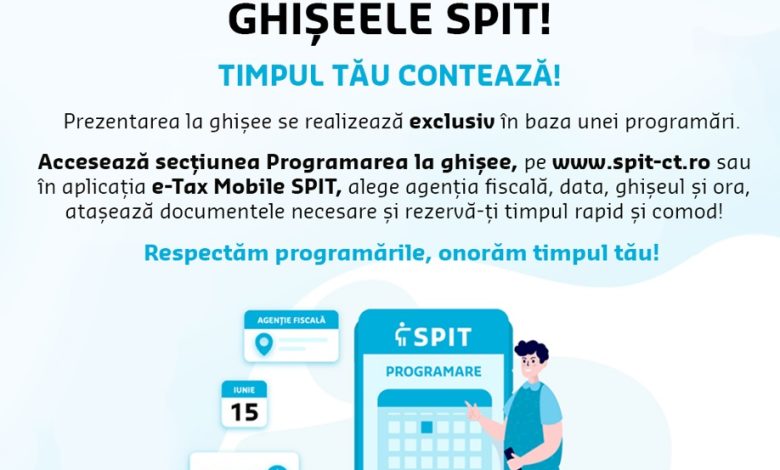 Prezentarea la ghișeele agențiilor fiscale se face exclusiv în baza unei programări, accesând secțiunea Servicii online/Programare la ghișee, sau prin intermediul aplicației e-Tax mobile SPIT.