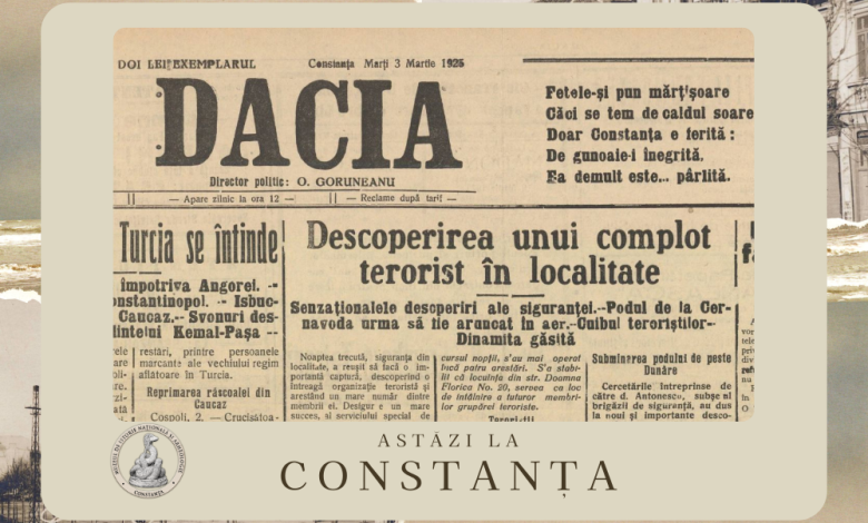 Pe data de 3 martie 1925, ziarul Dacia publica pe prima pagină, cu litere de o șchioapă, un articol cu titlu și subtitluri extrem de alarmante: Descoperirea unui complot terorist în localitate – Senzaționalele descoperiri ale Siguranței – Podul de la Cernavodă urma să fie aruncat în aer – Cuibul teroriștilor – Dinamita găsită!