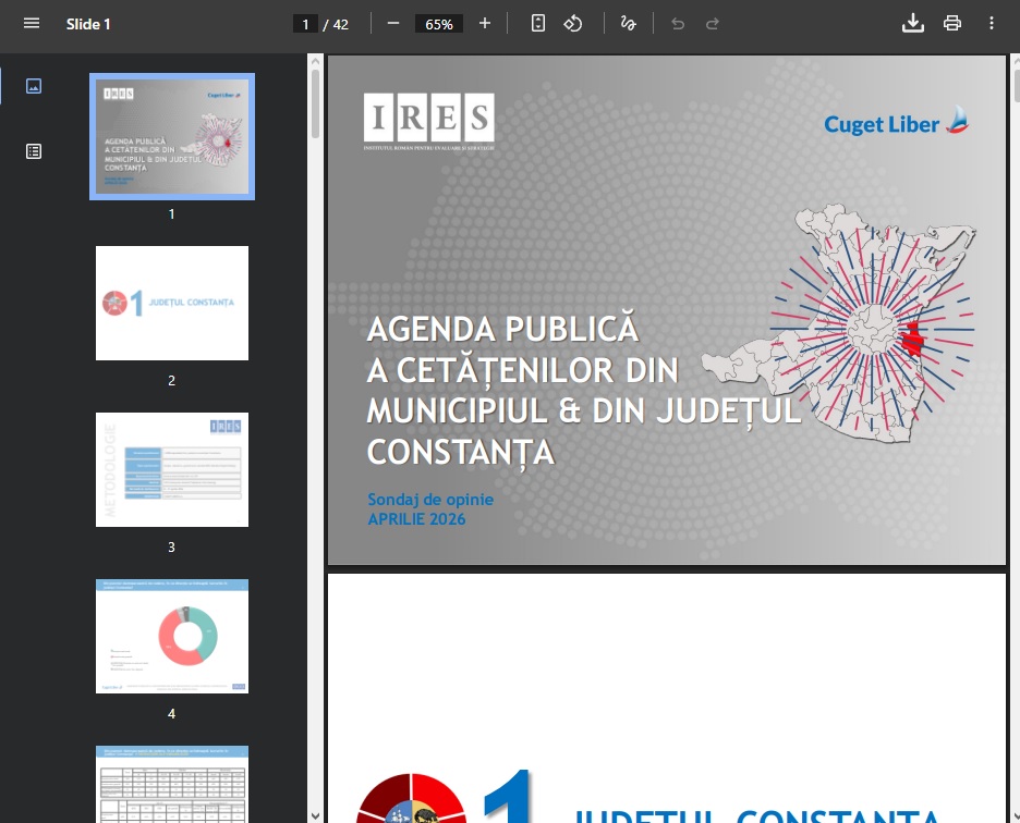 În acest context, din dorința de a oferi o imagine cât mai fidelă și obiectivă asupra realității din teren, publicația Cuget Liber își continuă demersul jurnalistic început în urmă cu mai mulți ani, apelând din nou la instrumente profesioniste de măsurare a opiniei publice. Astfel, a fost comandat un nou sondaj sociologic realizat de IRES, care își propune să surprindă atât nivelul de satisfacție al populației, cât și principalele preocupări și priorități ale constănțenilor în raport cu administrația locală și județeană.