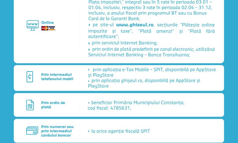 Read More »Serviciul Public de Impozite și Taxe Constanța pune la dispoziția contribuabililor următoarele modalități de plată a impozitelor și taxelor locale/speciale…